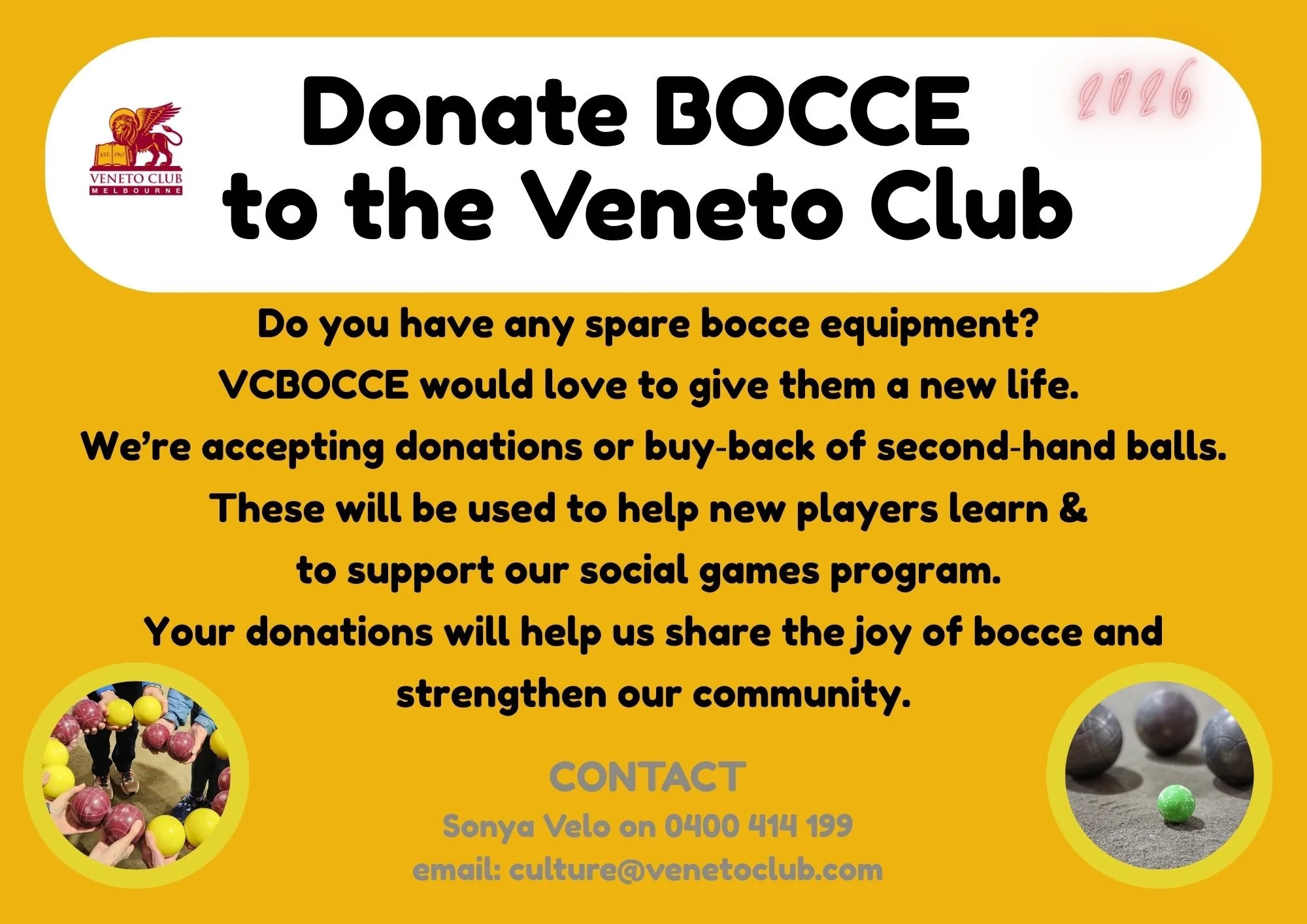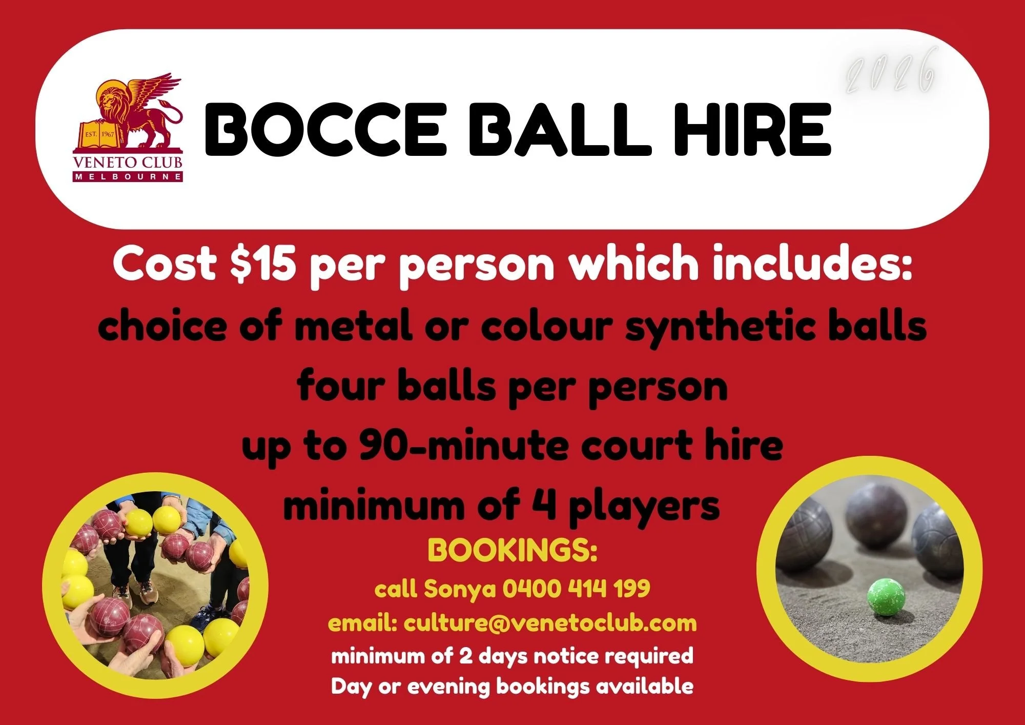For any bocce-related queries please email culture@venetoclub.com or sports@venetoclub.com and we will put you in touch with the relevant bocce contacts.